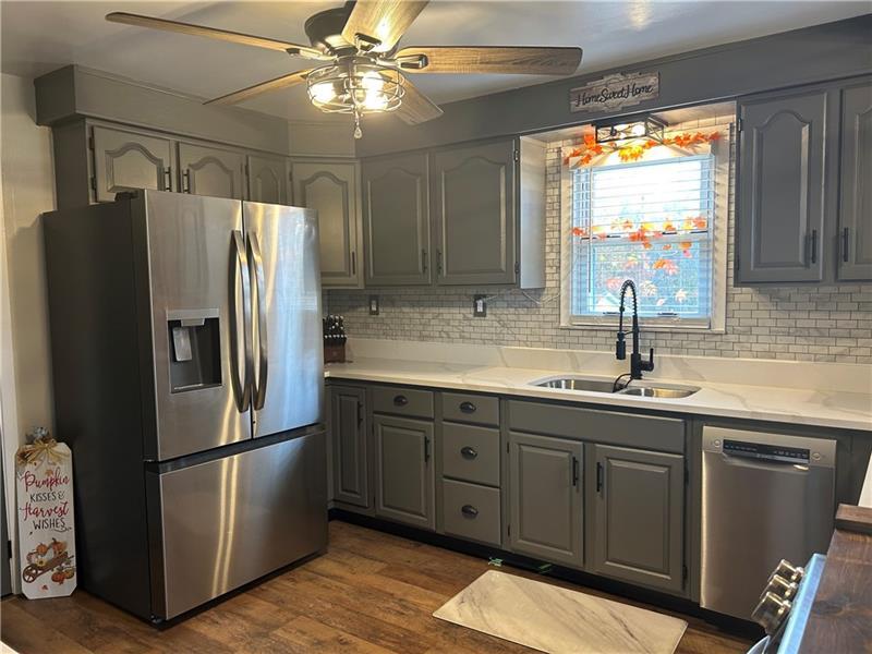 This lovely home on 1 acre is ready for the next owners! In the past 2.5 years this home has been upgraded with all new flooring, light fixtures, painted, remodeled kitchen and two full baths. You will be impressed as soon as you walk into the living room. This stunning kitchen comes with quartz countertops, newer S/S appliances, tile backsplash, spacious pantry, door to side porch and extra counterspace for your coffee/wine bar. Dining room can be converted back to 4th bedroom if needed. Main floor is completed with full bath and primary bedroom. Upstairs you will find double hall closet and two bedrooms with one that is used for WIC and office. Lower level boosts gameroom, full bath, tons of storage space and laundry room area that is walk-out to the back yard. Property has a partially fenced in area, 1.5 detached garage (21x21), 5 concrete off-street parking and shed. Concrete sidewalks and porches. Nice location! 1 Year Home warranty included! Come and see this move-in ready home!